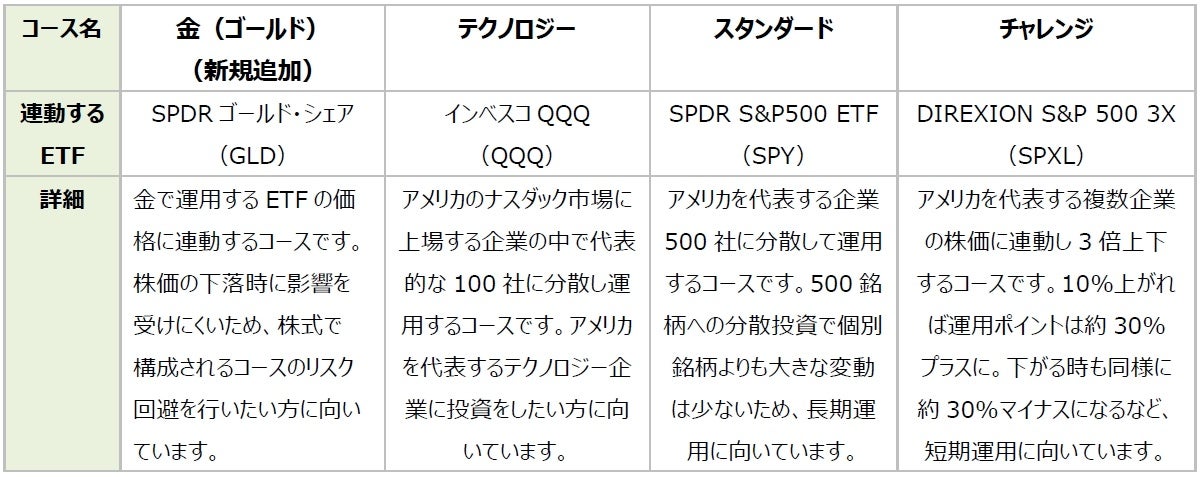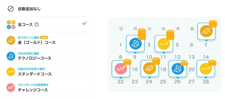 全コースに追加(運用)できるコースです。新たにPayPayポイントが付与されたタイミングで金額が、「金(ゴールド)コース」 → 「テクノロジーコース」 → 「スタンダードコース」 → 「チャレンジコース」、の順に自動追加されます。どのコースを選ぶかお悩みの方にもおすすめです。