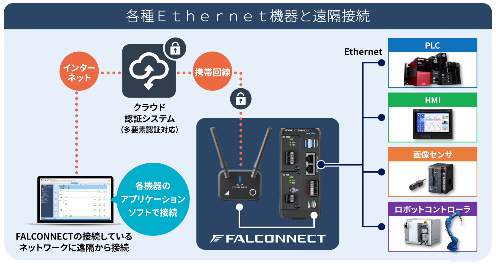 工場の生産設備や施設の制御には、PLC(Programmable Logic Controller)を始めとした制御機器が多く使用されています。FALLCONNECTはそれら制御機器にEthernet接続すると、携帯回線を通じて遠隔のパソコンからプログラムをモニタ、変更が可能になります。
