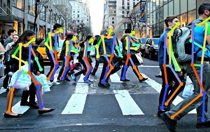 姿勢推定(Pose Estimation)、姿勢検知、または骨格推定、骨格検知などと呼ばれる、画像や動画から人物の姿勢を推定するAI技術で、アジラの行動認識AIの重要な要素技術。性能評価のためのメトリクスは、関節座標の位置が適切かどうか(精度:mAP)、計算リソースの軽量度(速度:fps)、人物のトラッキング性能(追随性:MOTA)、ロバスト性能(激しい動き、入力映像の明暗、重なりや遮蔽)など。