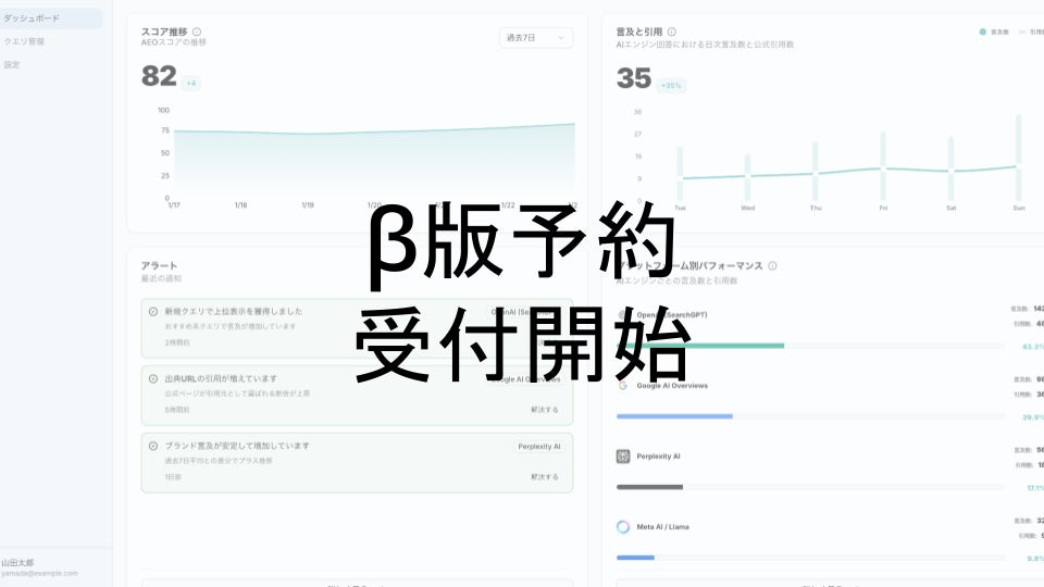 株式会社Tech Knowledge Base(本社:京都府、代表取締役:永淵 翔大)は、生成AI時代の新しい検索可視性指標「AEO score(AEO:Answer Engine Optimization. GEO, LLMOとも)」を可視化するAEOモニタリングツール「Sighted(サイテッド)」のβ版予約受付を開始しました。