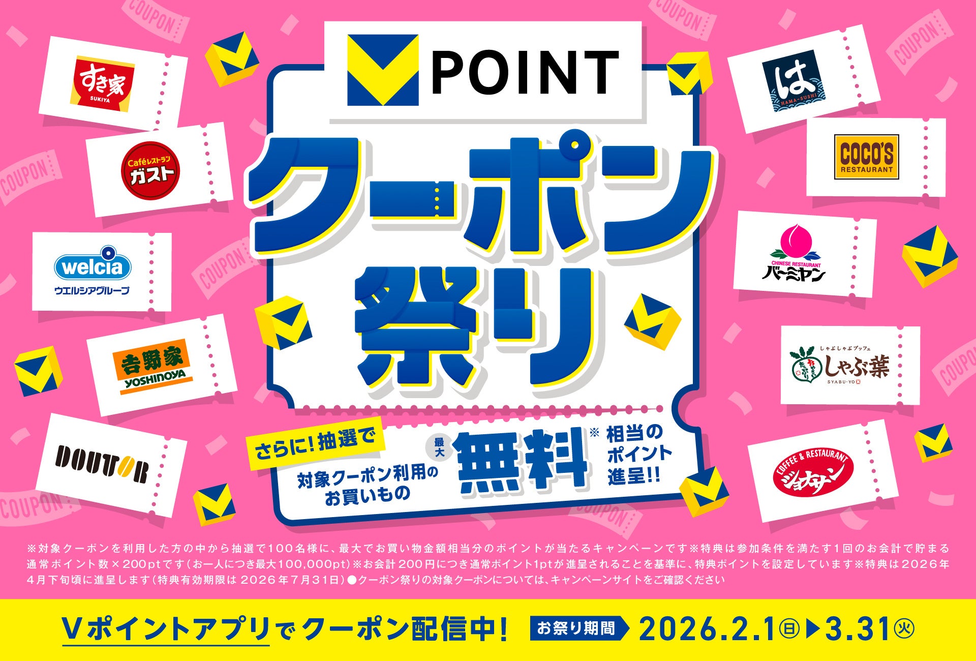 CCCMKホールディングス株式会社(本社:神奈川県横浜市、代表取締役社長兼CEO:髙橋 誉則、以下「CCCMKHD」)は、2026年2月1日(日)から3月31日(火)まで、Vポイントがお得に貯まる「クーポン祭り」(https://vpoint.net/vc2)を開催します。モバイルVカード対応店舗全店で使える「毎週配信!1週間ずっと2倍クーポン」や、さまざまなVポイント提携先の利用でVポイントがもらえるクーポンなど、通常よりもお得にお買い物やお食事を楽しめるキャンペーンです。さらに抽選で、最大でお買い物金額相当分のVポイントが当たる「お買い物最大無料キャンペーン」も実施します。