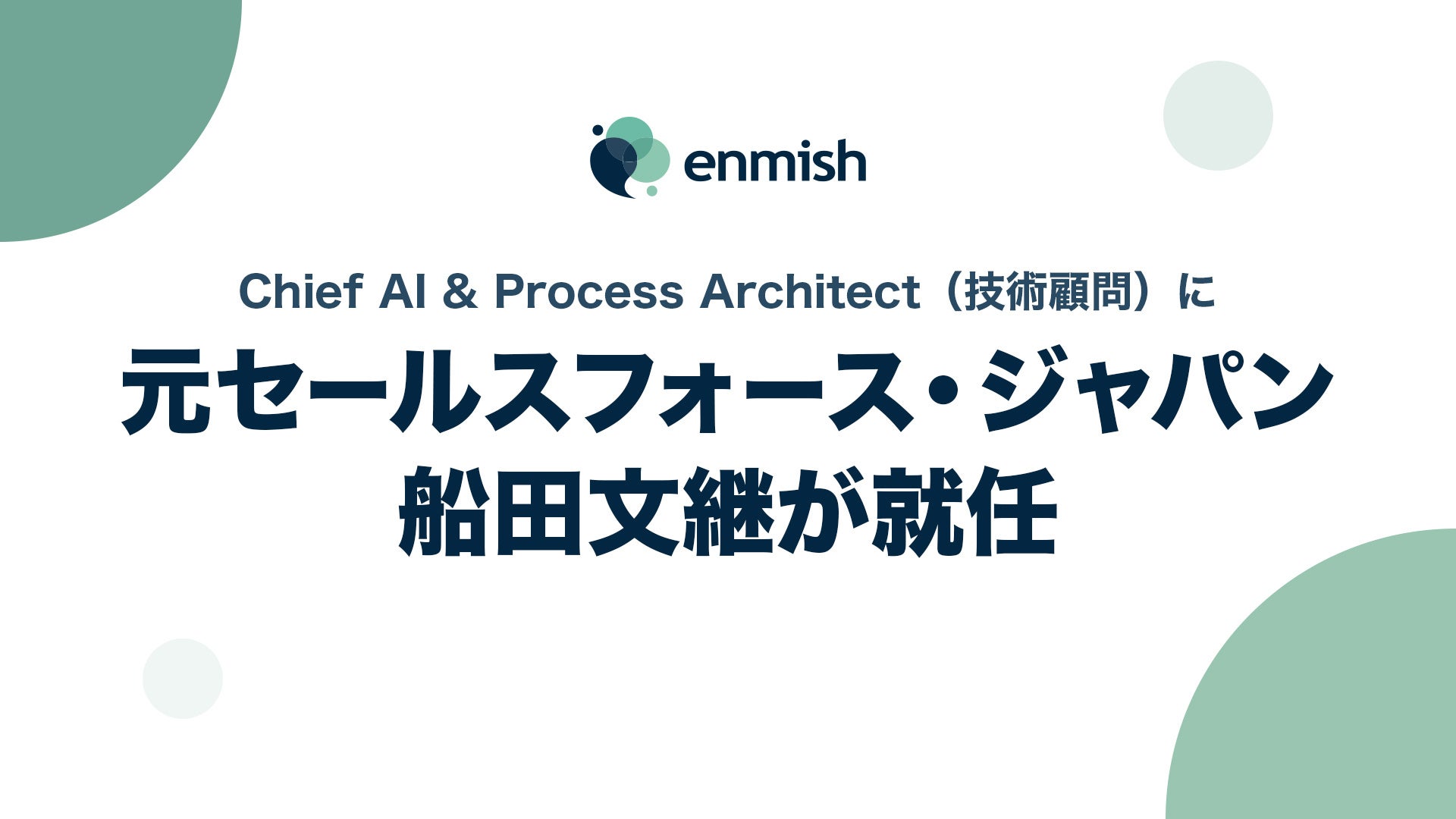 株式会社エンミッシュ(本社:東京都渋谷区、代表取締役社長 河原 義平)は、2月1日付けでChief AI & Process Architect(技術顧問)に元セールスフォースジャパンの船田文継(以下、船田)が就任したことをお知らせいたします。