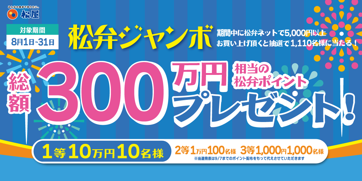 そんな「松弁ネット」で、8月中を受取日時として5,000円以上お買い上げ頂くと、抽選で1,110名様に「総額300万円相当の松弁ポイント」が当たります!