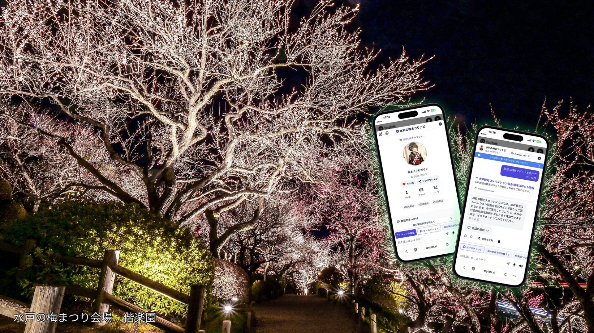 株式会社ブリッジウェル(本社:東京都江東区、共同代表:筒井訓章)は、茨城県水戸市の偕楽園と弘道館で2026年2月11日から開催される「水戸の梅まつり」において、AIガイド「ToyTalk」を活用した実証実験を実施することをお知らせします。本実証は、当社が提唱する新しいAI活用カテゴリ「スポットAI」を、茨城県内では初めて公開・検証する事例となります。