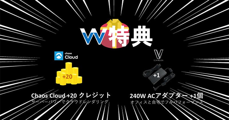 本キャンペーンは、ELSA社「VELUGA」とChaos社「V-Ray」をセットでご購入頂いた方を対象に、特典と特別価格をご提供します。