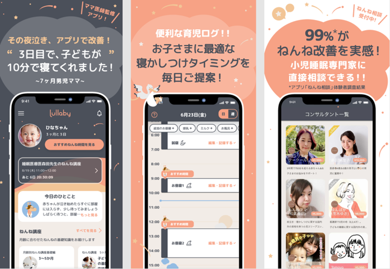 Moon Creative Lab Inc.は三井物産グループの新規事業開発、ビジネスインキュベーションを推進するベンチャースタジオ。44,000 人を超える三井物産グループ全社員からアイデアを発掘し、それを具体化する為の機能と環境を提供し、世の中にインパクトのある新しいビジネスの創出を目指します。Moonのインキュベートする「Lullaby」では、2021年4月にモバイル向けアプリをリリース。アプリ内の「ねんね相談」サービス利用者の99%が「ねんねが改善した」と評価しています。