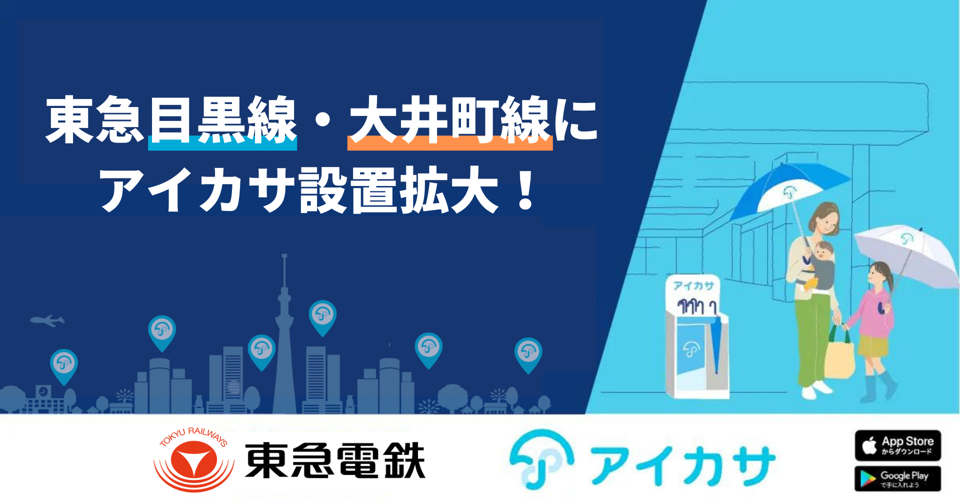 日本の使い捨て傘ゼロを目指す傘のシェアリングサービス「アイカサ」を運営する株式会社Nature Innovation Group(本社:東京都渋谷区、代表取締役:丸川照司、以下「アイカサ」)は、東急電鉄株式会社(本社:東京都渋谷区、取締役社長:福田誠一、以下「東急電鉄」)の運営する東横線と田園都市線に続き、2022年7月28日より東急目黒線、大井町線の2路線の14駅に設置拡大いたしました。都心から住宅街に続く東急線での雨の日の移動がより便利に快適になると同時に、使い捨て傘によるゴミの削減による環境問題の解決にも貢献してまいります。