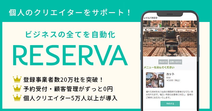 RESERVAは、美容・理容・ヨガ・フィットネス・音楽・料理・キャリア・育児・占いなど350業種以上の個人商圏を最大化する支援を行っています。