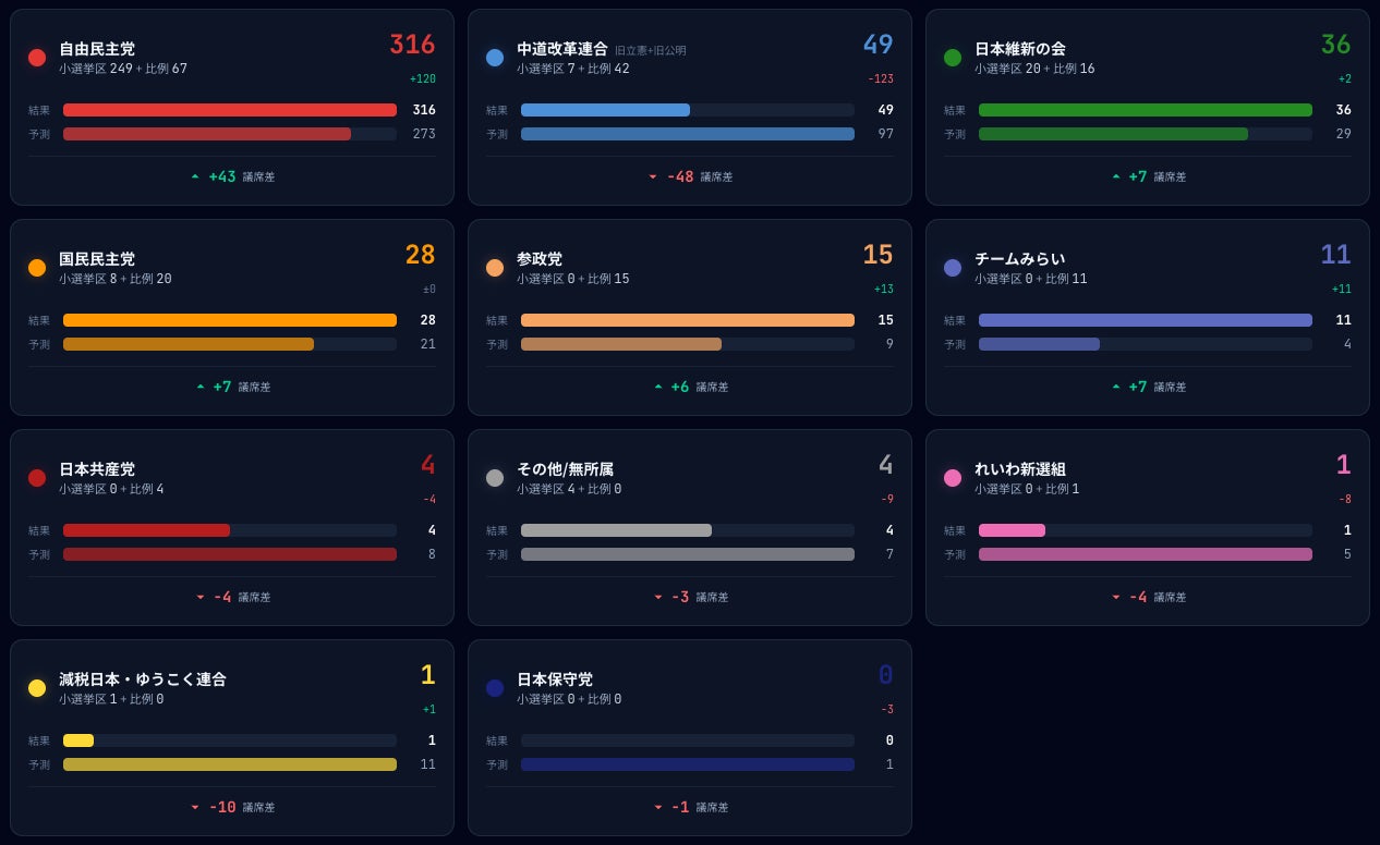 AIによる分析と予想でしたが、最終的には大手メディアを変わらない予想となった一方で、自民党の躍進については想定以上、中道の衰退も想定以上と、なりました。