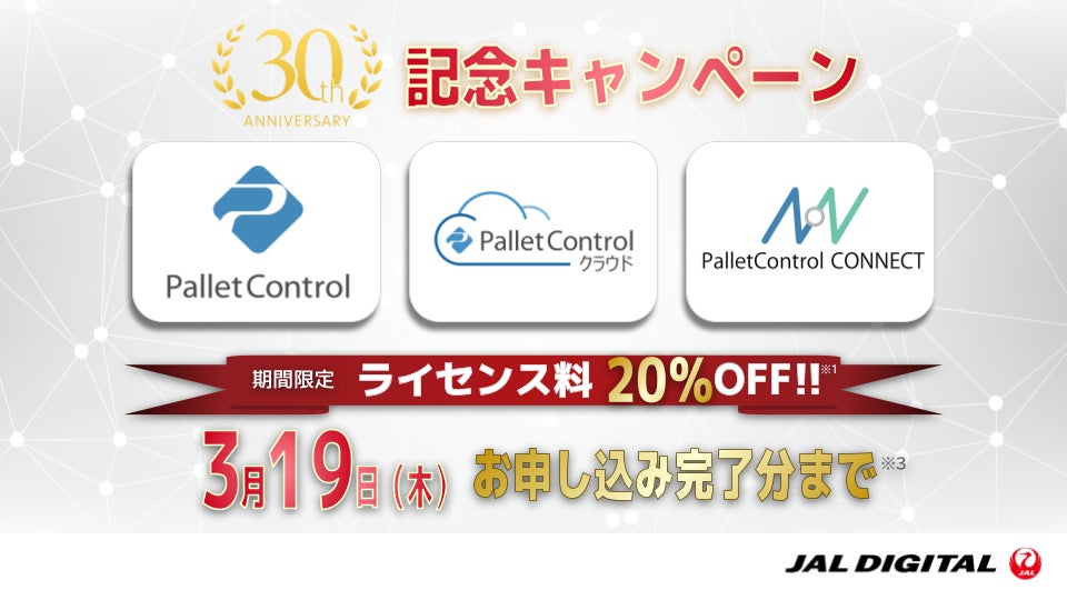 JALデジタル株式会社(本社:東京都港区、代表取締役社長:鈴木 啓介、以下JALデジタル)の自社開発製品であるIT資産管理ツール「PalletControl(パレットコントロール)」は、1996年に販売開始し、皆さまのIT資産管理を支え続けて今年で30周年を迎えます。長年のご愛顧に感謝を込めて、2026年はさまざまなキャンペーンを実施します。