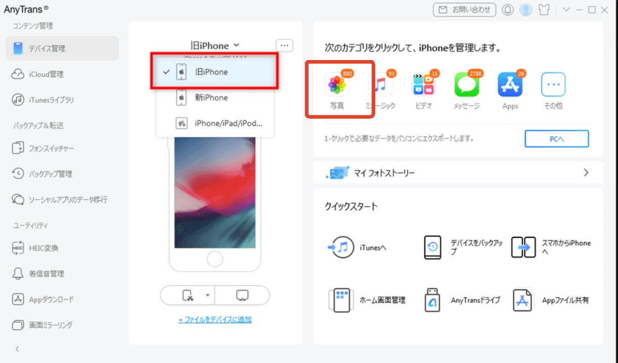 Step 2:【旧iPhone】を選択して、ホーム画面から「写真」をクリックします。