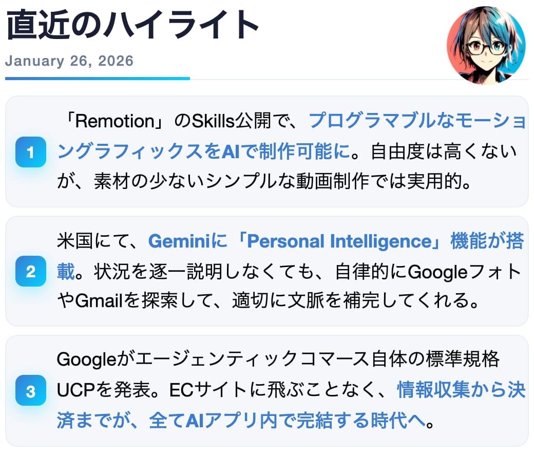 【購読者8.5万人突破】NoLang開発チームが最前線の知見を凝縮して届ける「Mavericks AI ニュース」の1月26日号を配信。RemotionやGeminiのパーソナライズ機能を徹底解説。
