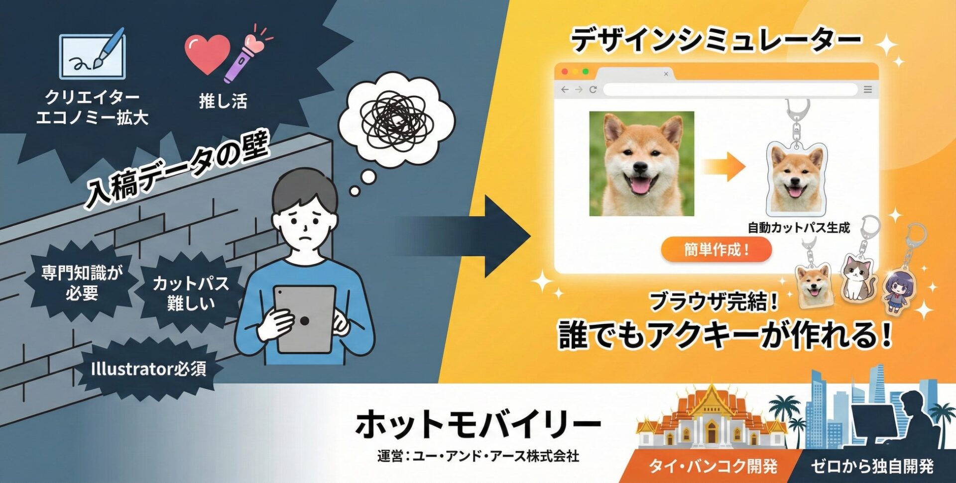 そんな中、オリジナルグッズ製作の老舗「ホットモバイリー(運営:ユー・アンド・アース株式会社)」が、この課題を解決するブラウザ完結型の高機能「デザインシミュレーター」をリリースしました。 驚くべきは、このシステムが単なる外注ツールではないということ。実は、ホットモバイリーの海外拠点であるタイ・バンコクにて、一人の天才的な自社エンジニアの手によってゼロから開発されたものなのです。