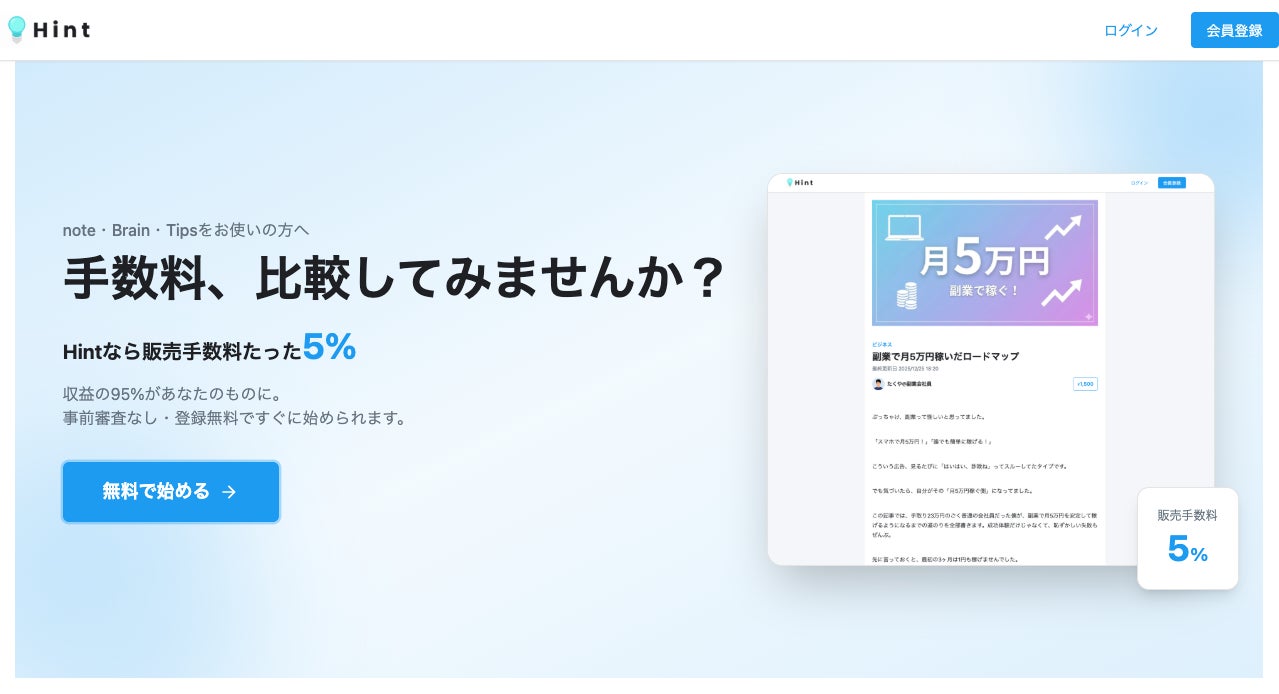 業界最安水準で、収益の95%がクリエイターの手元に残ります。Hintの販売手数料は5%で、これは主要な競合サービスと比較して大幅に低い手数料です。
