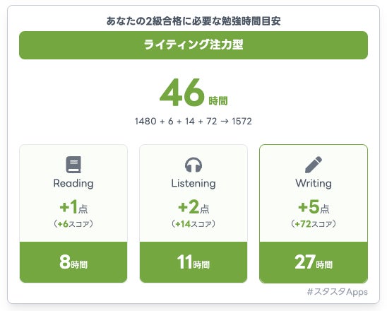 スタディスタジオ株式会社(本社:東京都渋谷区、代表取締役:鈴木孝一)が運営する英検®学習支援Webアプリ「スタスタApps」は、英検®一次試験の結果をもとに、次回合格に必要な勉強時間と学習プランを提示する機能「合格時間ナビ」を、2025年度第3回(会場試験)の結果発表タイミングに合わせて最適化しました。