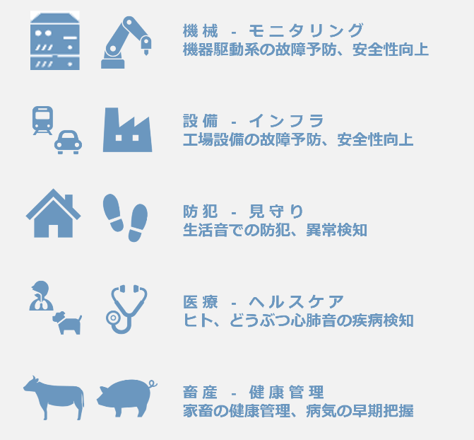 人の耳で聞いてわかるものは、現在の技術レベルでも実現可能となっており、音による異音検知は、工場インフラの異常検知、機械音検知をはじめとして、足音や防犯、ヒトの発する音や動物の鳴き声など、幅広い業種・業態で利用が始まっています。