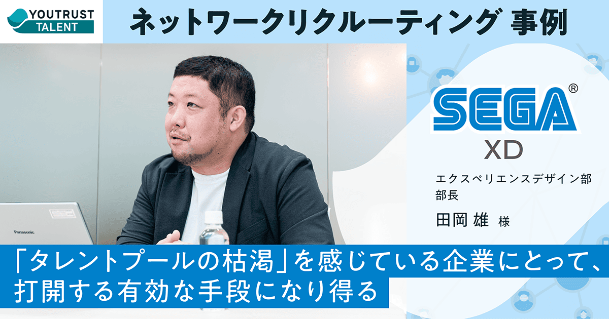 日本のキャリアSNSおよびネットワークリクルーティングサービス「YOUTRUST」を開発・運営する株式会社YOUTRUST(本社:東京都渋谷区、代表取締役社長:岩崎由夏)が、株式会社セガ エックスディー(本社:東京都新宿区、代表取締役 社長執行役員CEO:谷 英高)におけるYOUTRUST TALENT活用事例を、自社メディア「NETWORK RECRUITING JOURNAL」にて公開したことをお知らせします。