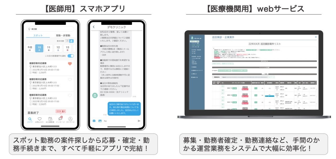 医療機関がアプリ登録した医師へ、直接スポットアルバイト求人の募集を行い、勤務者選定・勤務手続まで効率的に業務をまわしていくことができるマッチングプラットフォームを展開します。