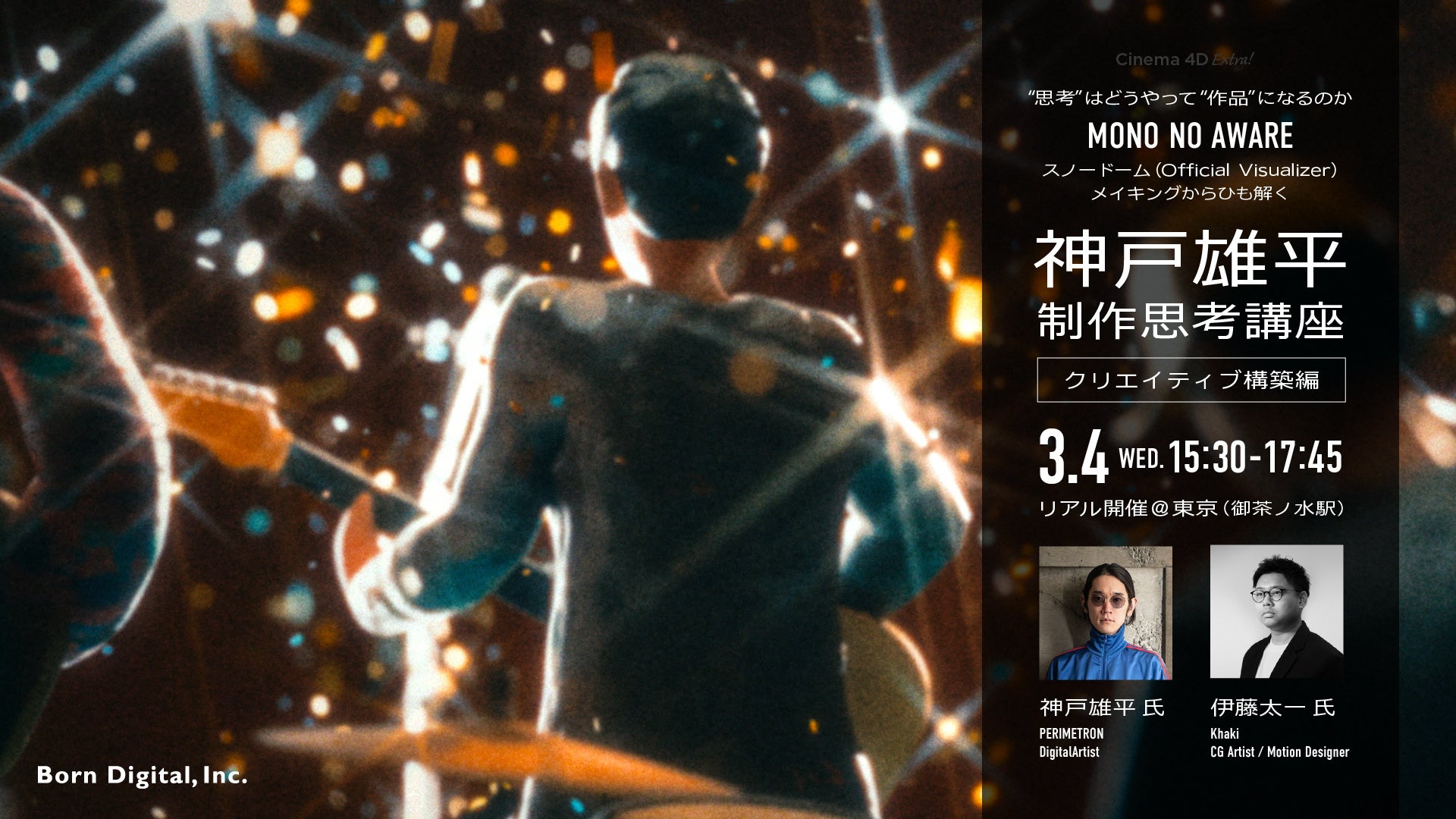 株式会社ボーンデジタル(本社:東京都千代田区、CEO:新 和也、URL:https://www.borndigital.co.jp/ )は、デジタルアーティスト・神戸 雄平氏によるセミナー「【“思考”はどうやって“作品”になるのか】MONO NO AWARE – スノードーム (Official Visualizer) メイキングからひも解く – 神戸雄平 制作思考講座【クリエイティブ構築編】」を、2026年3月4日(水)にワテラスコモンホールにて開催いたします。