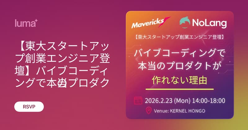 日本発の動画生成AIプロダクト「NoLang」を開発する株式会社Mavericks(本社:東京都文京区、代表者:Founder CEO 奥野 将太)は、2026年2月23日(月・祝)に、AI時代のプロダクト開発の実態と必要な知見をテーマとした登壇イベント「バイブコーディングで本当のプロダクトが作れない理由」をKERNEL HONGO(東京都文京区)およびオンラインで開催いたします。参加費は無料、事前登録不要です。