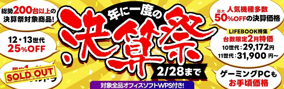 好評開催中の『年に一度の決算祭』セールも最終日2/28まで残すところあと7日、定番オフィスソフトWPS付きが付いてくるお得な対象商品を200台規模でご用意。最大50%OFFの目玉商品、特選第12・13世代ノートPC、コストパフォーマンス重視の第8世代、クリエイター向けミドル-ハイエンドPCやゲーミングPCなどもご用意、多様化するPC選びのニーズに対応します。