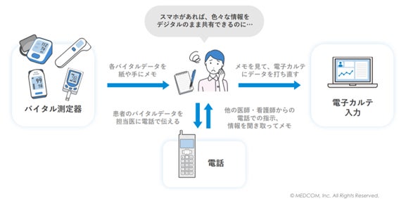 こうした課題に対し、「メドコム」は医療現場の業務効率化および安全性を担保したスマートフォンサービスとして、医療業務のデジタル化・効率化を促進してきました。特にPHSからスマートフォンへの移行が進む中、音声通話だけでなく、電子カルテや業務支援アプリとの連携を実現し、業務のDX化を推進してまいりました。