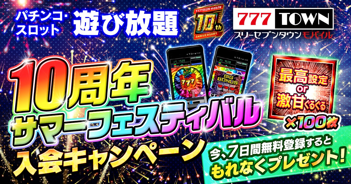 今年10周年を迎えた777TOWN mobileでは最高設定で遊べるアイテムや景品応募券をプレゼントする「10周年サマーフェスティバル」を開催中!