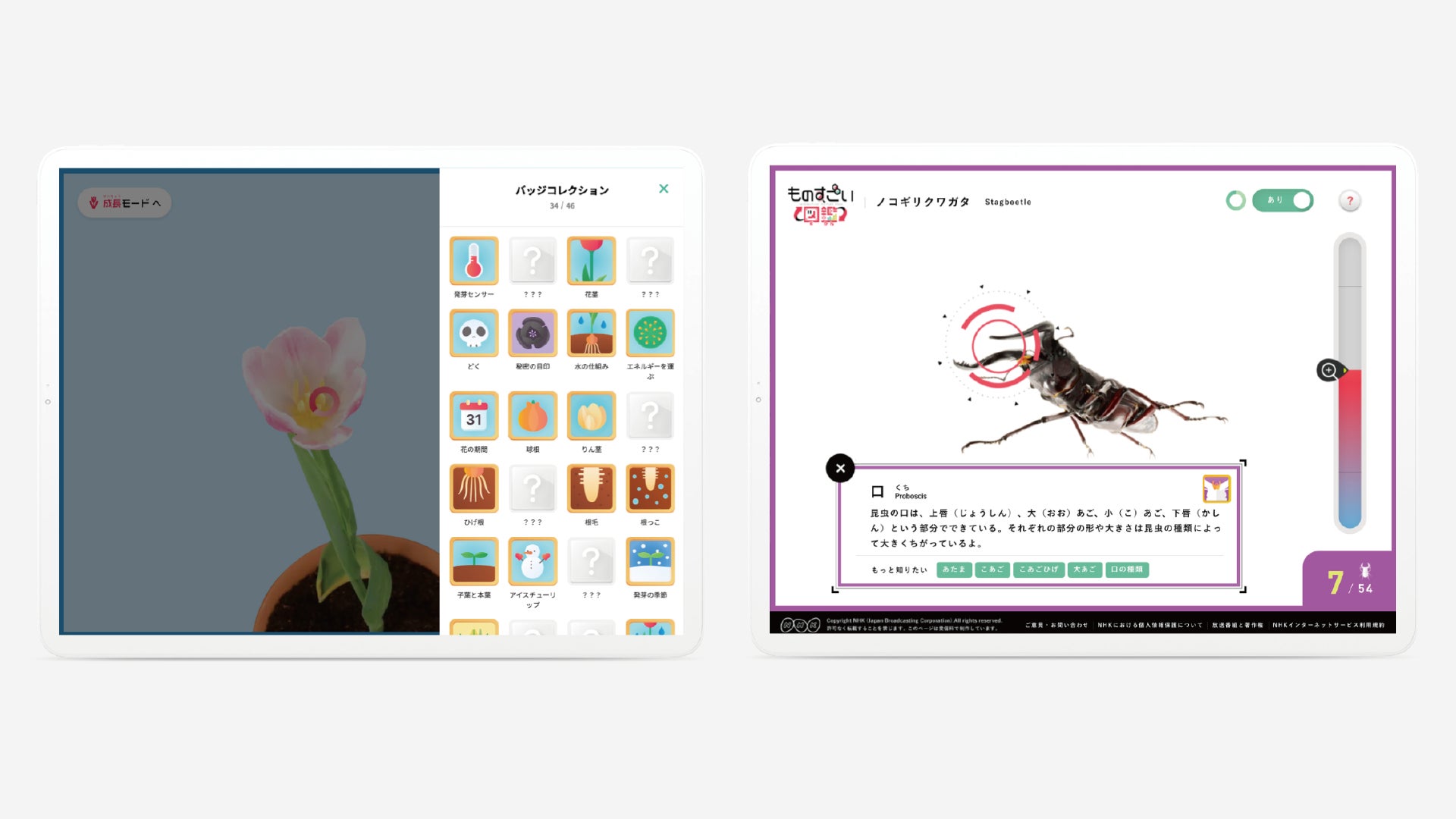 子供たちが楽しめるように、バッチを集めてコンプリートするゲーム要素を加えつつ、植物図鑑には探究心を育てるためのヒント機能も盛り込みました。