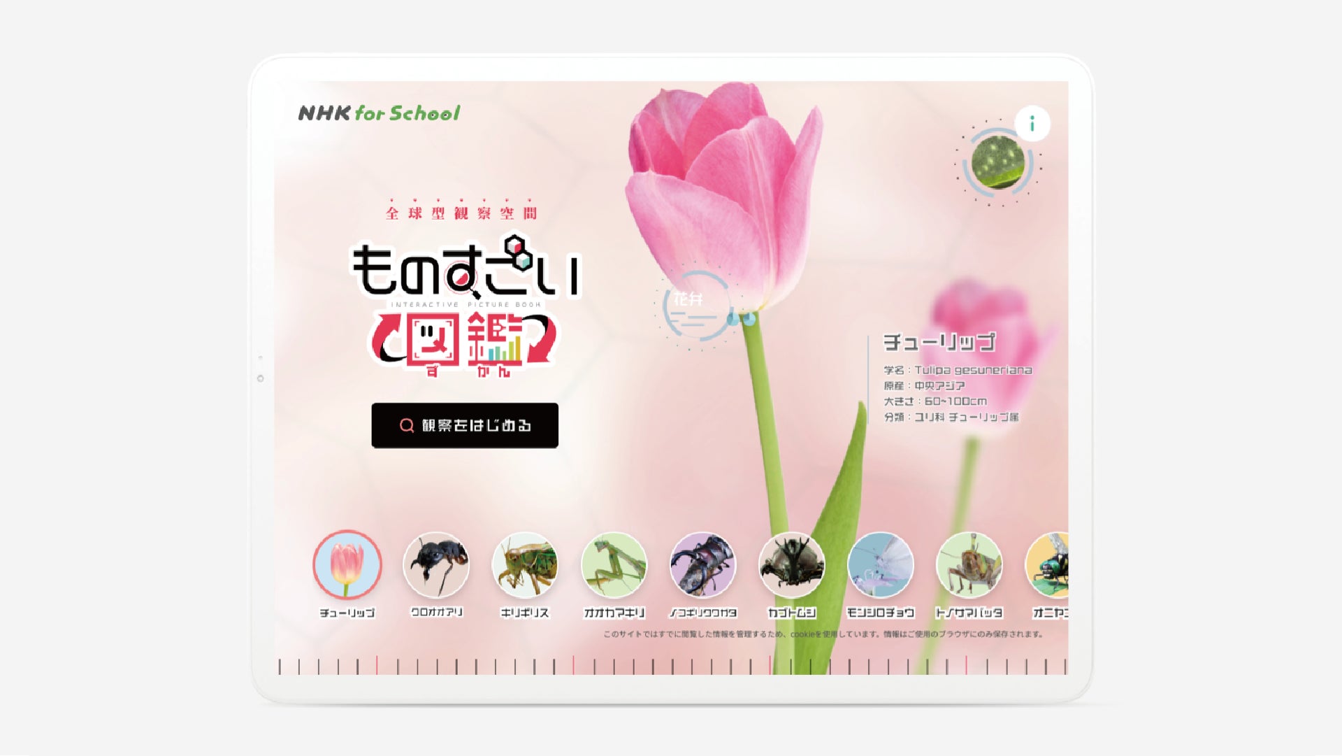 全天球撮影された高画質な写真を、ぐるぐると回転・ズームさせながら観察できます。昆虫の「電子顕微鏡モード」では、数万倍以上の拡大表示でさらに詳しく観察することもできます。昆虫や植物の部位に表示されているポイントをクリックすると、その部位についての詳しい説明や、NHK for Schoolで配信中の同番組の動画クリップが現れます。