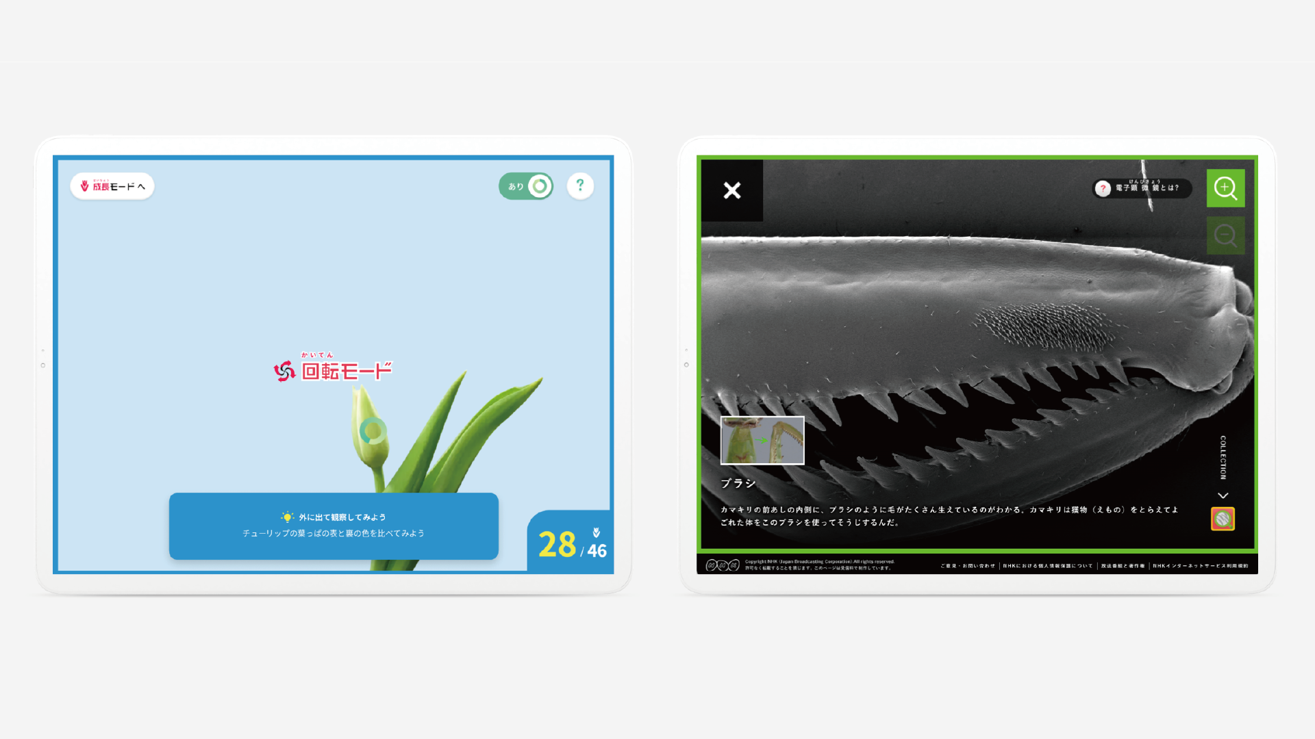 全天球撮影された高画質な写真を、ぐるぐると回転・ズームさせながら観察できます。昆虫の「電子顕微鏡モード」では、数万倍以上の拡大表示でさらに詳しく観察することもできます。昆虫や植物の部位に表示されているポイントをクリックすると、その部位についての詳しい説明や、NHK for Schoolで配信中の同番組の動画クリップが現れます。