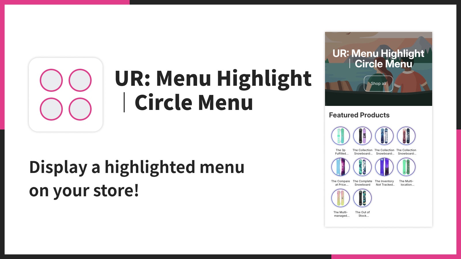 「UR: Menu Highlight|Circle Menu」は、ストア内のナビゲーションを強化するためのサークル型メニューを簡単に追加できるノーコードアプリです。