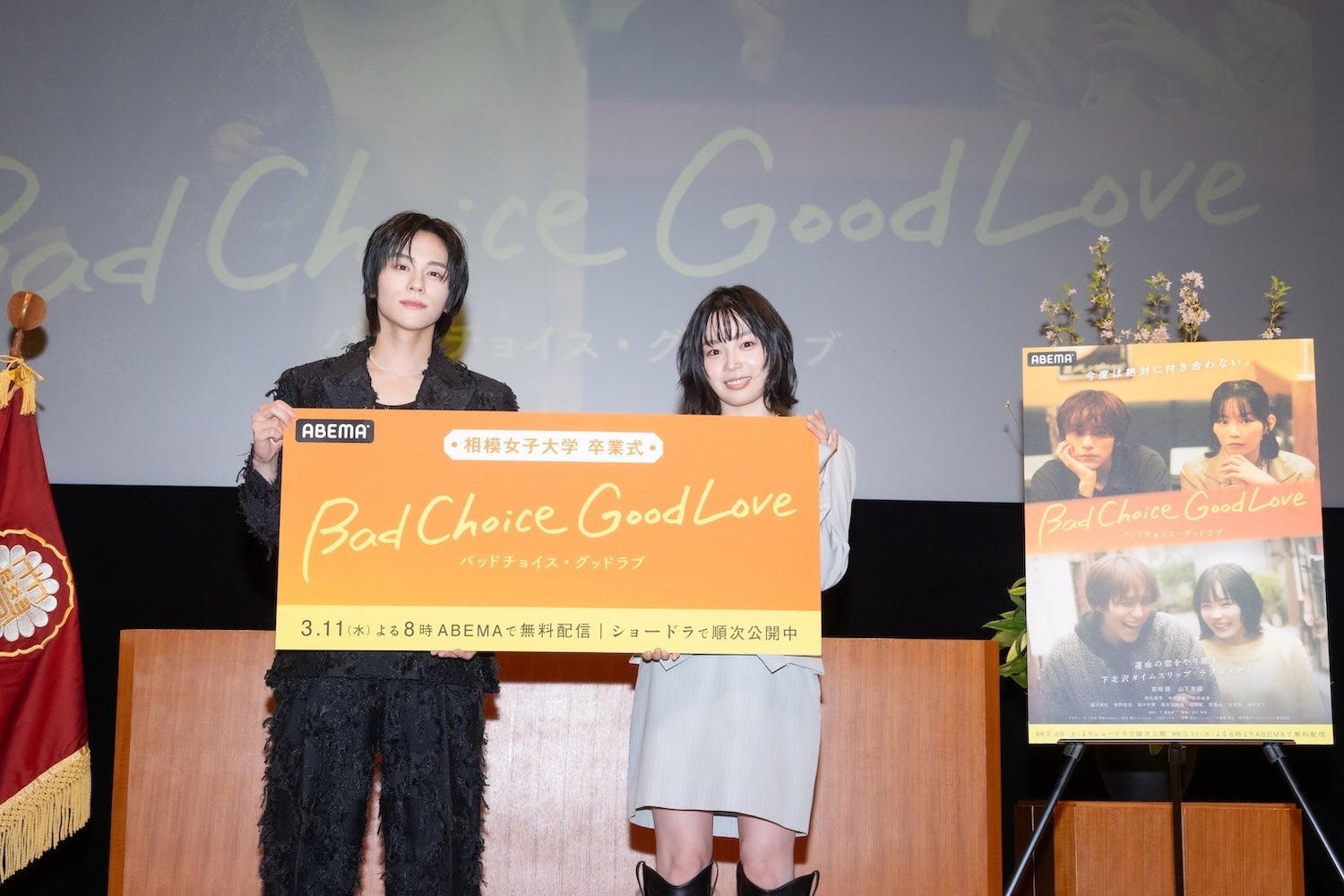 新しい未来のテレビ「ABEMA(アベマ)」は、2026年3月11日(水)夜8時より無料配信を開始する「ABEMA」とショードラの“縦横連動ハイブリッドドラマ”『バッドチョイス・グッドラブ』のサプライズ登壇イベントを、2026年3月6日(金)に相模女子大学グリーンホールにて開催いたしました。