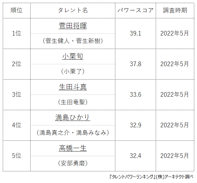 本ランキングは、2022年5月度に実施したタレント調査データ(一部過去実施データ)を利用し、タイトルに応じてランキング形式でまとめたものです。