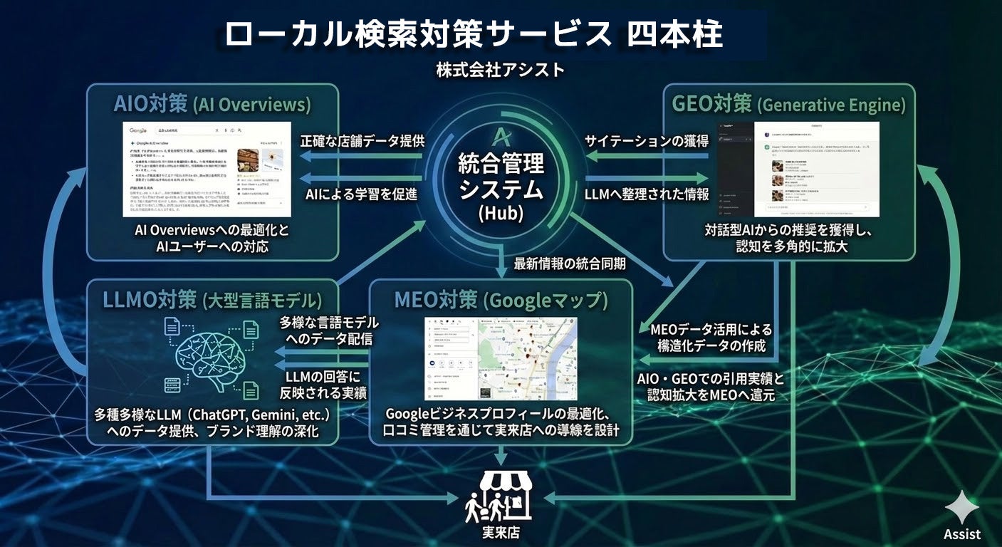 株式会社アシスト AIO・GEO・LLMO・MEOを網羅したローカル検索対策サービスの販売代理店募集を千葉エリアで開始。生成AIの回答を最適化し、実店舗とユーザーの出会いを最先端技術で支援。