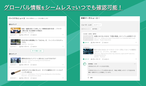 見逃しがちな海外情報を画面を切り替えなしで確認できるようになりました。さらに、あなたの業務や組織に必要な情報を閲覧・保存/共有(マーク)すると、言語に関わらずAIの学習が進みます。そのため、普段は国内情報のみを見ていた方でも、AIが海外での必要情報とその関連情報も推薦するように成長していきます。