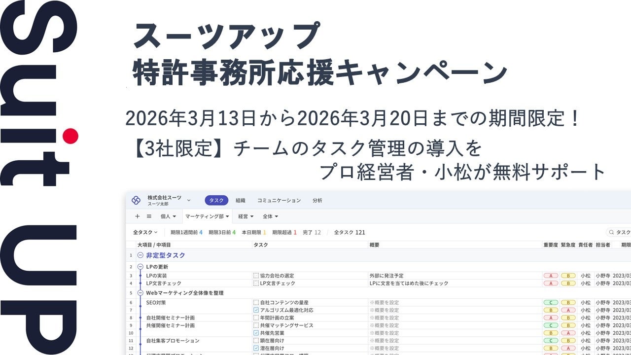 株式会社スーツ(所在地:東京都千代田区、代表取締役社長CEO:小松 裕介)は、AIタスク管理・プロジェクト管理ツール「スーツアップ」において、特許事務所応援キャンペーンを実施いたします。
