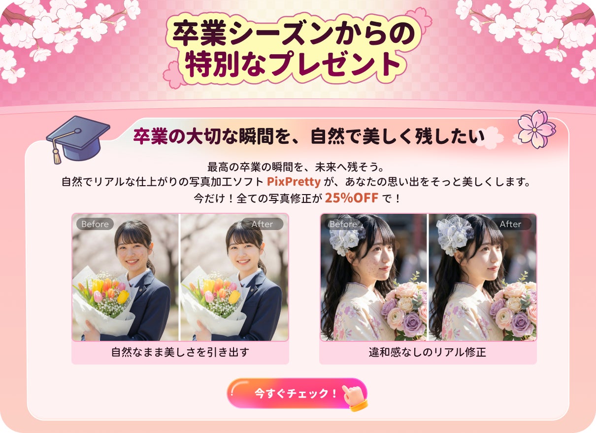 この春、AIを活用した美肌加工アプリ「Tenorshare PixPretty」が、卒業・入学シーズン限定の特別キャンペーン「春の思い出美化応援キャンペーン」をスタート!全製品を25%OFFでお得に手に入れられる絶好のチャンスです。美肌加工から自然な小顔補正まで、誰でも簡単にプロ並みの仕上がりが実現できる今が狙い目です。