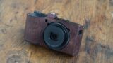 一枚革で包み込むように装着するGR4ボディスーツは、三箇所のホックでカメラに固定します。