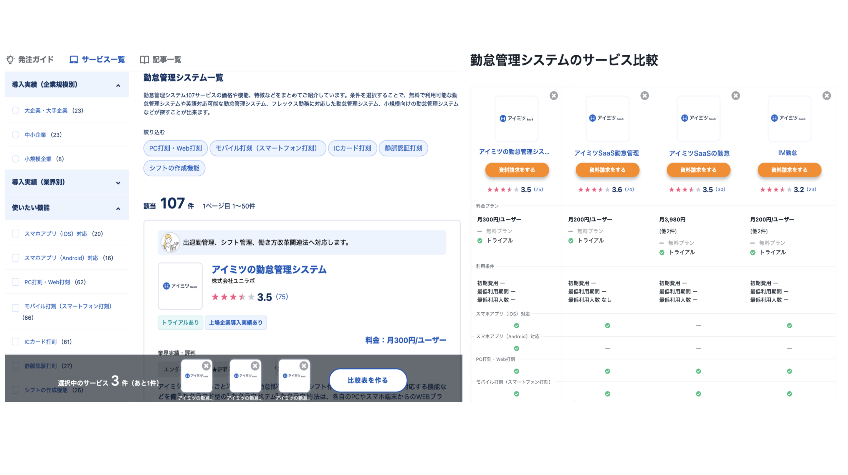 アイミツSaaS(https://saas.imitsu.jp/)では、このようなSaaS導入検討における阻害要因を解消すべく、各サービスの特徴を横並びで比較できる『比較表機能』を新たにリリースしました。