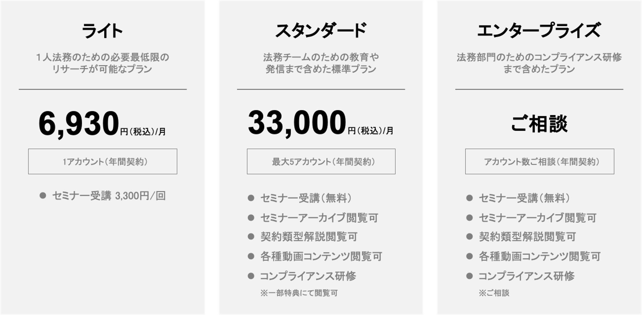 BUSINESS LAWYERS LIBRARYは、日本最大級の法律書籍・雑誌が閲覧できるサブスクリプションサービスです。法務部門におけるリサーチ業務の負担を軽減するため2020年にリリースしました。リモートワークの普及に伴い、「在宅勤務でも法律書籍を閲覧したい」というニーズが高まり、大企業を中心に2022年7月現在800社を超える法人内で利用されています。ライトプランの月額6,930円(税込)から、1,300冊を超える法律雑誌・法律書籍の閲覧ができ、横断検索も可能です。主要な法律系出版社24社が参画(2022年6月1日現在)しております。また、上位プランでは、今回追加した機能に加え、法務の学習・教育のための動画コンテンツの提供に加え、定期的に開催している有償セミナーを無償で受講することが可能です。