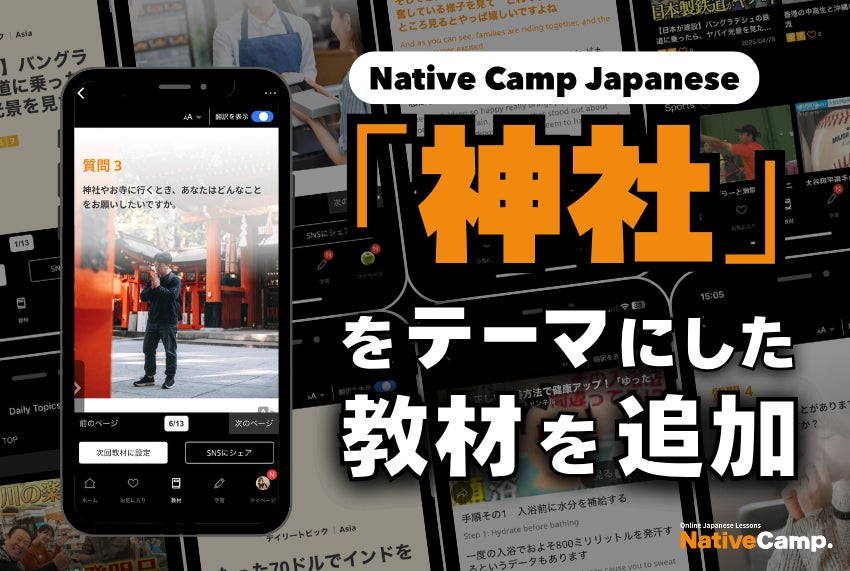 株式会社ネイティブキャンプ(本社:東京都渋谷区、代表取締役社長:谷川国洋)が提供するオンライン日本語会話サービス『Native Camp Japanese』では、このたび、人気教材「デイリートピック」に“神社”をテーマにした教材を追加しました。