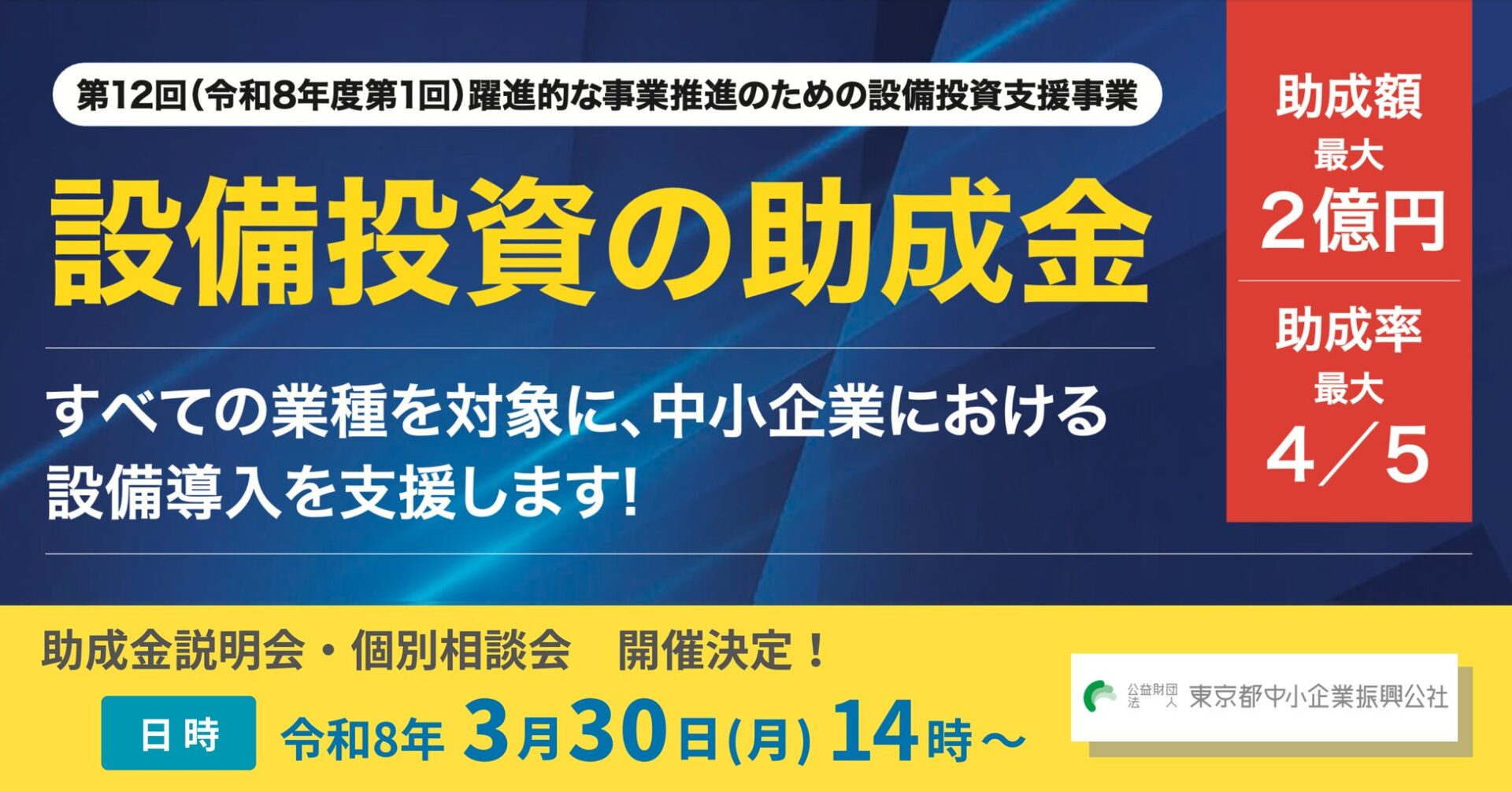 公益財団法人 東京都中小企業振興公社(本社:東京都千代田区、理事長:中西 充)では、東京の産業力の強化及び都内経済の持続的発展につなげていくことを目的として「第12回(令和8年度第1回)躍進的な事業推進のための設備投資支援事業」の申請を4月21日(火)から受け付けます。
