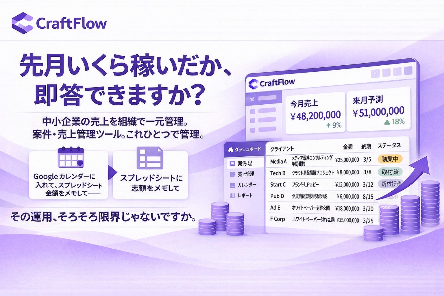 案件が増えてきて、スプレッドシートでの管理に限界を感じている方。「今月の売上はいくらか」「来月の入金はいつか」をすぐに確認したい方。CraftFlowなら案件を登録するだけで、売上集計・入金予測・納期管理が自動化されます。