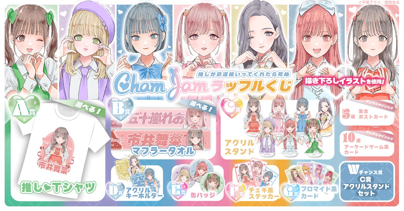 本オンラインくじでは、ChamJamメンバーによる全人類に捧ぐ「ハートポーズの神ファンサ」が尊すぎる原作者 平尾アウリ先生による限定描き下ろしイラストを贅沢に使用いたしました。
