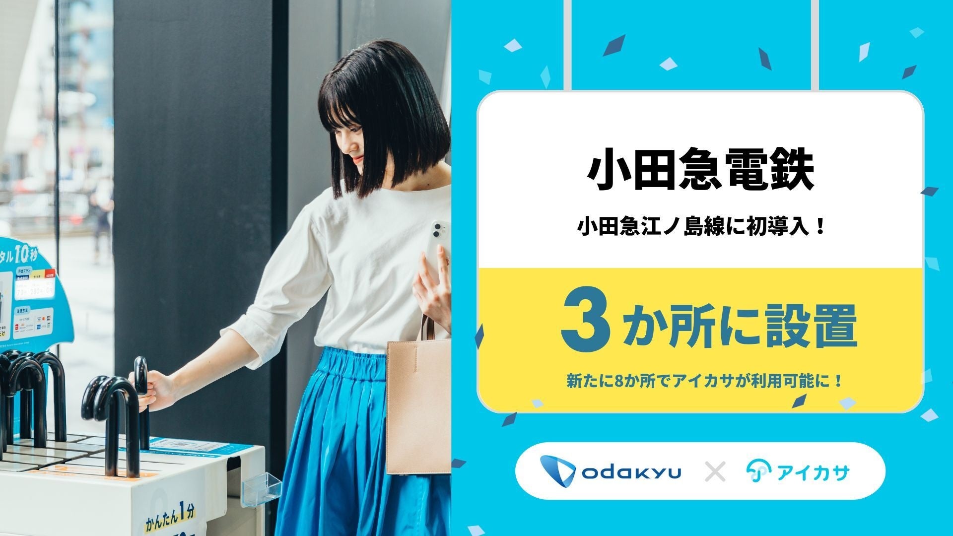 アイカサと小田急電鉄は、この度、沿線にお住まいの方の生活利便性向上はもちろんのこと、「小田原」「片瀬江ノ島」といった日本屈指の観光地へのアクセスを担う鉄道路線として、観光客の皆様に天候に左右されない快適な回遊環境を提供するため、未設置エリアへの導入を本格化いたします。