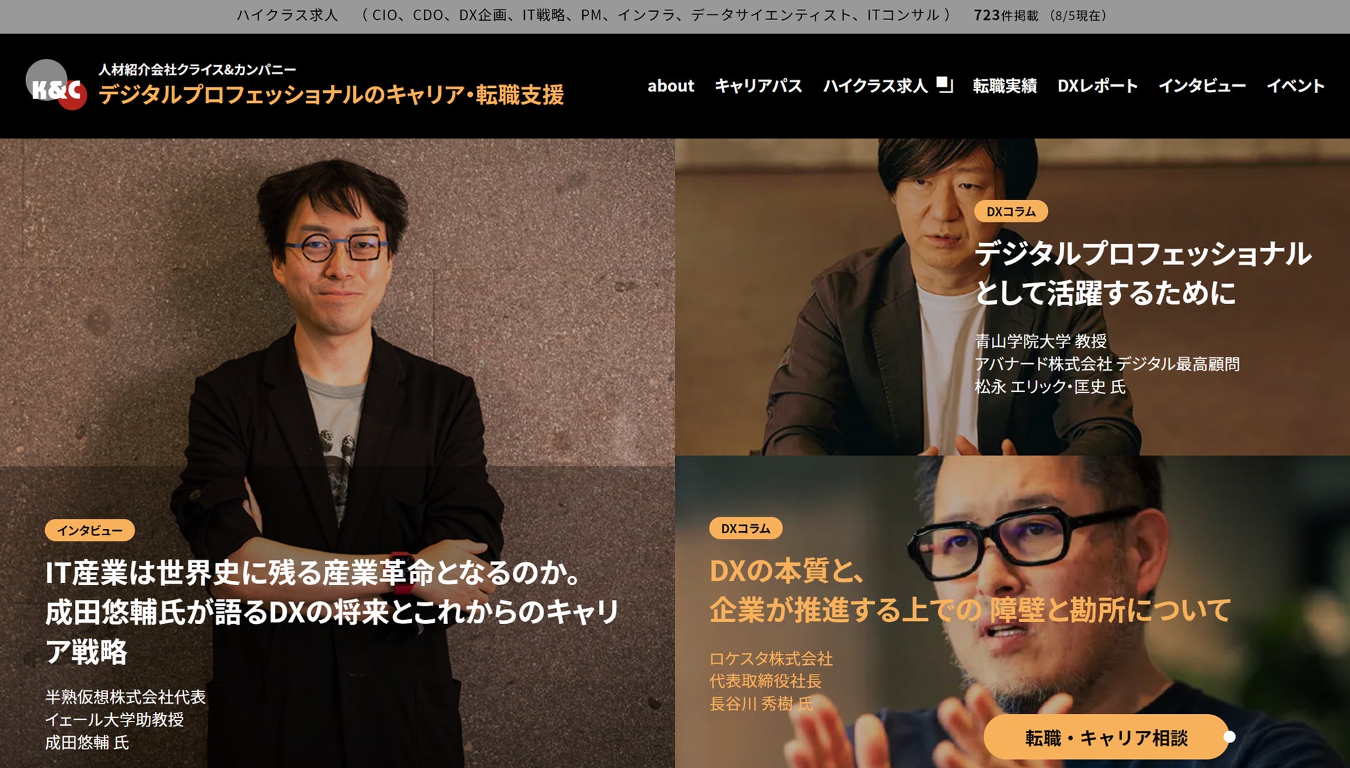ハイクラス転職支援サービスの株式会社クライス&カンパニー(本社所在地:東京都港区、代表取締役社長:丸山 貴宏)は、転職市場でのデジタル・IT人材の需要増加を受け、デジタルプロフェッショナル領域の転職・キャリア戦略情報に特化した専門サイト「デジタルプロフェッショナルのキャリア」を8月5日(金)にリニューアルオープンいたしましたのでお知らせいたします。リニューアルに際して、トップコンテンツとして成田悠輔氏のスペシャルインタビューも公開しています。