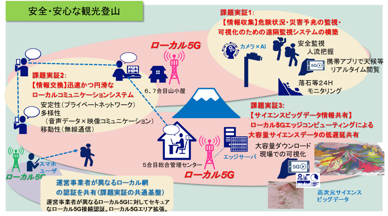 山梨県(山梨県甲府市丸の内1-6-1)、山梨県富士山科学研究所(山梨県富士吉田市上吉田字剣丸尾5597-1)、東京大学(東京都文京区本郷7丁目3−1)、NECネッツエスアイ株式会社(東京都文京区後楽2-6-1 飯田橋ファーストタワー)、株式会社インターネットイニシアティブ(東京都千代田区富士見2-10-2 飯田橋グラン・ブルーム)、株式会社ヤマレコ(長野県松本市庄内1-8-12 1F)、およびNPO法人中央コリドー情報通信研究所(東京都新宿区百人町1-1-8 リープ新宿102号室、以下CCC21-NPO)は、CCC21-NPOを代表機関とするコンソーシアムを形成し、令和3年度・総務省「課題解決型ローカル5G等の実現に向けた開発実証」に採択された、『富士山地域DX「安全・安心観光情報システム」の実現』の実証事業により富士山におけるローカル5Gの有効性を検証しました。