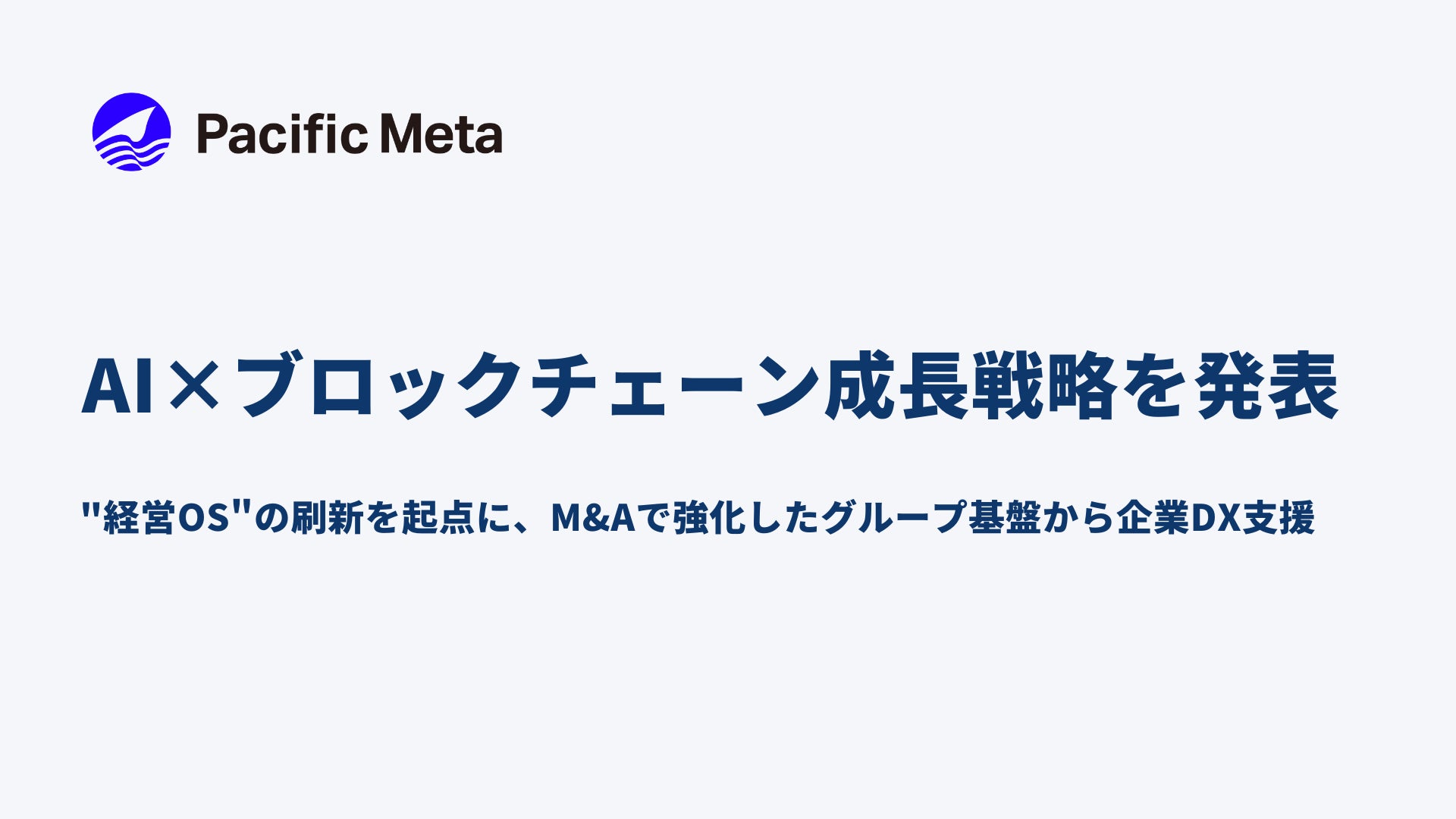 株式会社Pacific Meta(本社:東京都港区、代表取締役:岩崎 翔太、以下「当社」)は、AI×ブロックチェーンの成長戦略を策定いたしましたので、お知らせいたします。当社は自社の経営基盤を「経営OS」と位置づけ、AI×ブロックチェーンによる継続的な刷新を推進しています。M&Aを通じて強化したグループの開発力・事業基盤を実証フィールドとして活用し、そこで得た知見と方法論をクライアント企業のDX支援へ展開していくことを戦略の柱としています。