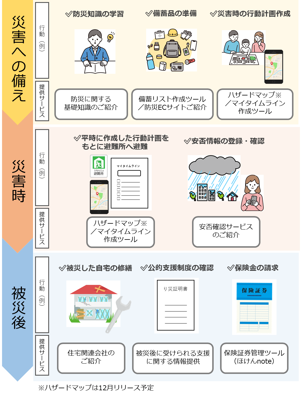 災害への備え・万が一の災害発生時・被災後において必要となる対応を漏れなくカバーすることを目指し、情報・サービスをご用意しました。今後、ご利用者さまのご意見を取り入れながら順次サービスを改善・拡充していく予定です。