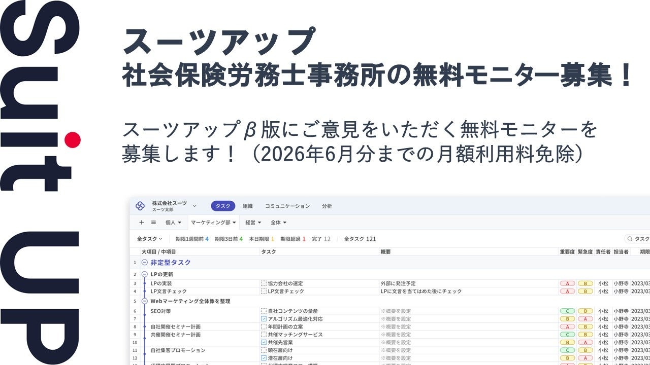 株式会社スーツ(所在地:東京都千代田区、代表取締役社長CEO:小松 裕介)は、AIでかんたん、チームのタスク管理・プロジェクト管理ツール「スーツアップ」において、社会保険労務士事務所の無料モニターを募集いたします。